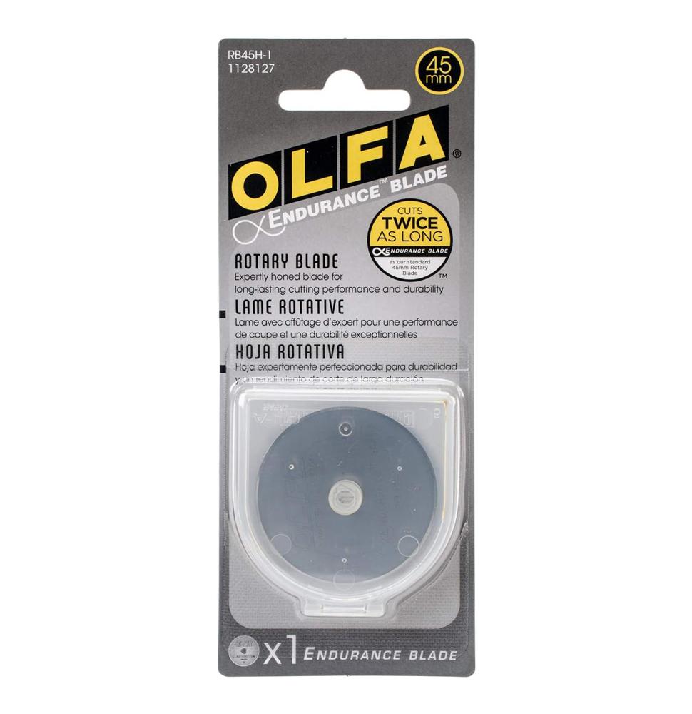 The OLFA 45mm Endurance™ Rotary Blade cuts twice as long as standard OLFA rotary blades and fits all OLFA 45mm rotary cutter handles. Made from the highest-quality tungsten steel, Endurance™ blades are manufactured with an exclusive metal hardening process that delivers two times the cut life. More cuts with fewer blade changes. Cut up to 8 layers of cotton fabric.